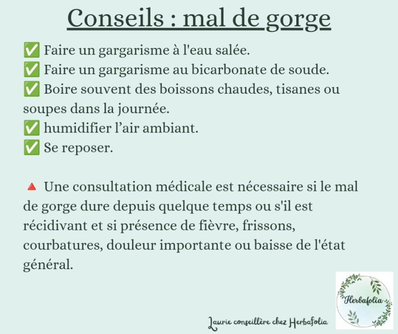 🔺 Une consultation médicale est nécessaire si le mal de gorge dure depuis quelque temps ou s'il est récidivant et si présence de fièvre, frissons, courbatures, douleur importante ou baisse de l'état général.